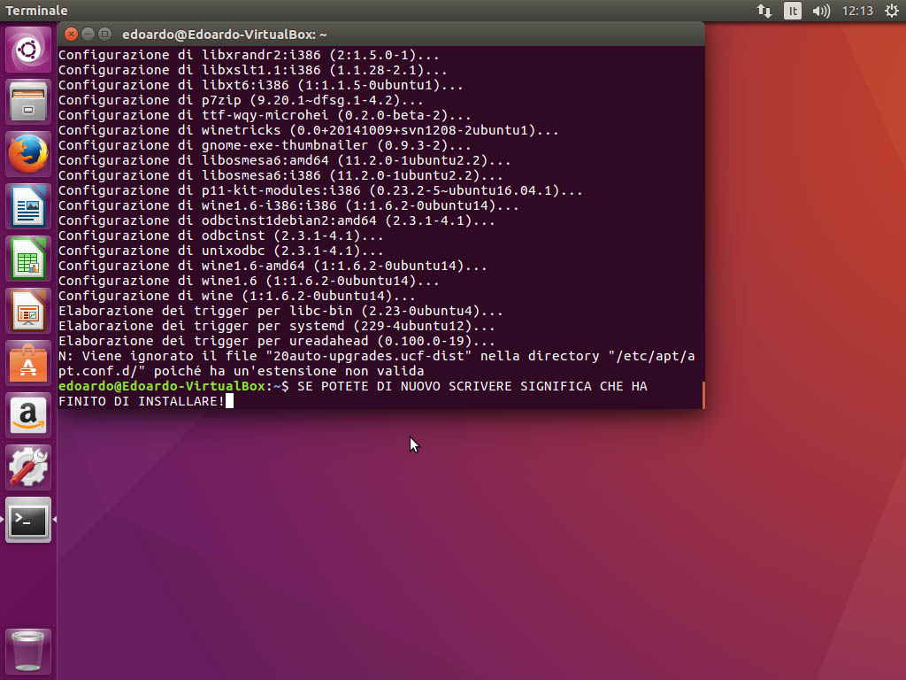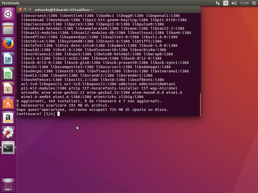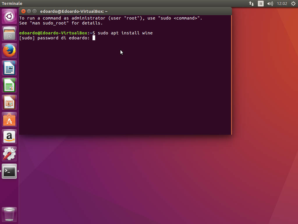 Una volta aperto scrivere "sudo apt install wine" (senza virgolette) e